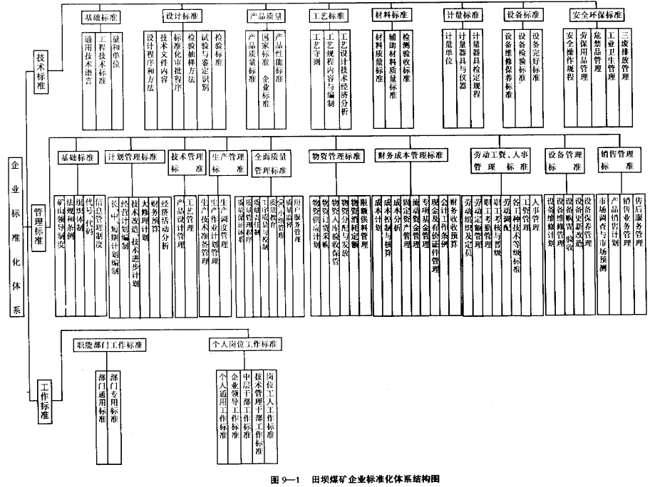 咨詢組通過對存在問題的深人調(diào)查、分析,提出以下改善建議:(1)結(jié)合本礦實(shí)際情況,編制了田壩煤礦標(biāo)準(zhǔn)化體系結(jié)構(gòu)圖,供企業(yè)在建立和完善標(biāo)準(zhǔn)化體系工作中參考、使用(見圖9-1 )