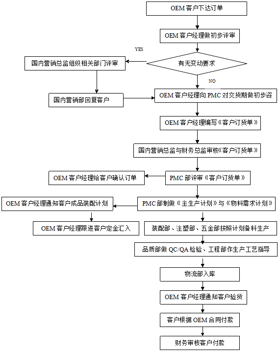 4.1 國內(nèi)營銷部接到客戶OEM訂單后,結(jié)合《OEM合作協(xié)議》審查訂單的單價、質(zhì)量要求、付款方式、交貨方式,符合則向PMC部初步咨詢能否滿足客戶訂單交期;不符合則組織相關(guān)部門進(jìn)行綜合評審,然后由PMC部確定訂單交期,OEM客戶經(jīng)理再和客戶協(xié)商更改訂單交期。