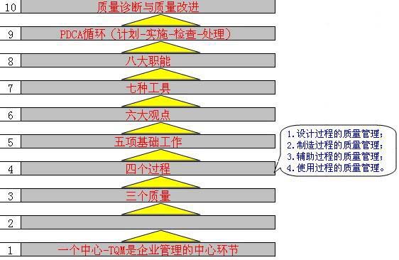 我們把TQM概括為:"一個中心、兩個方針、三個質量、四個過程、五項基礎、六個觀點、七種工具、八大職能、PDCA、質量診斷與質量改進等十個方面。