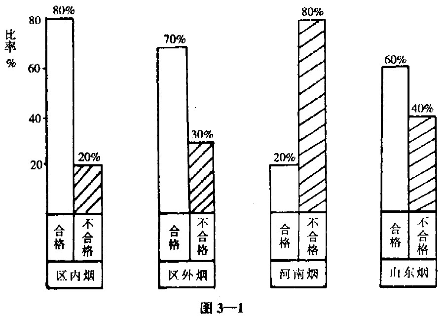 每年7-8月至第二年的6月為一個煙葉收購年度,區內煙一般在當年11月就能收購完畢,占全部收購量的3/4左右。其余由區外或省外調撥來煙葉的時間不定,省外煙葉大半在次年上半年調人。由于區內煙近幾年來實行了統一管理,工廠把質量抓到改良煙葉品種、科學種植和初烤上,所以收購時質量較好,降變級、霉變轉少,確保了企業大部分原料的質量。目前煙葉質量的主要矛盾在于區外和省外,尤其是省外,省外又以河南煙葉為最差,圖3-1為內外煙葉質量比較。