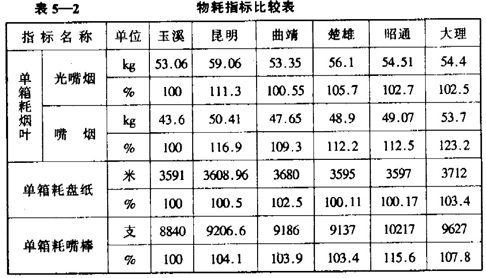 消耗高的原因,既有設(shè)備、工藝方面的,也有相關(guān)大一部分是管理方面的,造成生產(chǎn)過程中過多的浪費(fèi)。如果各個(gè)煙廠能把消耗降低到玉溪煙廠目前水平(玉溪煙廠的消耗也還可以降低),按照今年各廠計(jì)劃產(chǎn)量計(jì)算,共可節(jié)約煙葉9373800千克,價(jià)值4278萬元,節(jié)約嘴棒55061萬支,價(jià)值1557萬元。用節(jié)約部分的煙葉,可以生產(chǎn)光嘴煙7萬多箱,嘴煙12.87萬箱,這些煙葉供一個(gè)大理卷煙廠規(guī)模的煙廠使用,還綽綽有余(參見表5-2).